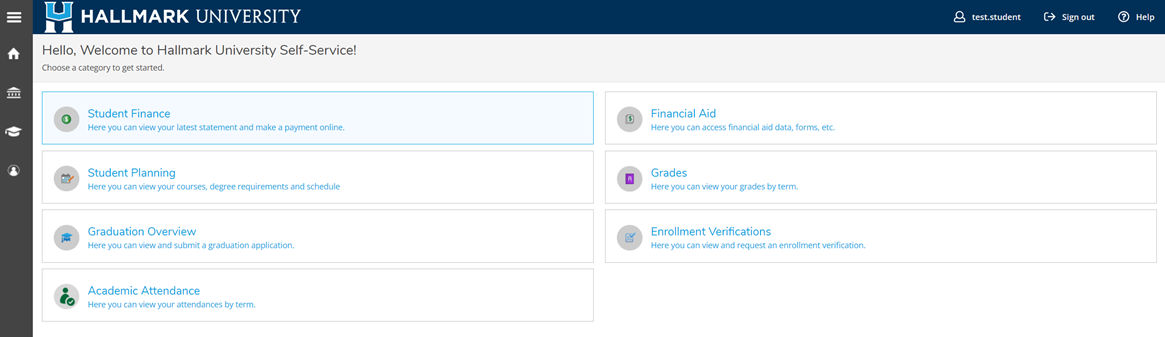 - You will now be in the Self-Service Portal. Here you can view your class schedule, grades, make payments, and more.