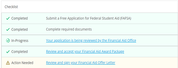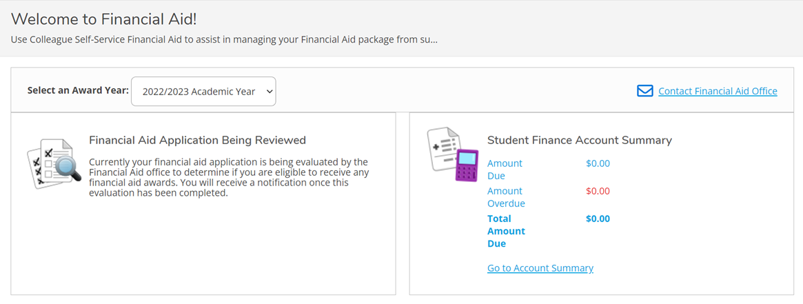 On the home page, select Financial Aid. Here you can submit financial aid documents, view the progress of those documents, and see loan amounts, and other resources.