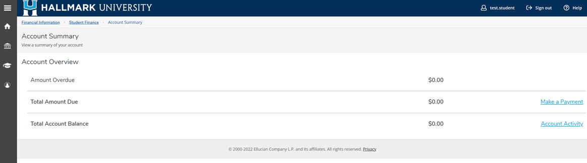- On the Self-Service home page, select Student Finance and you will be taken to Account Summary. On this page, you can view amounts due and previous payments you made.