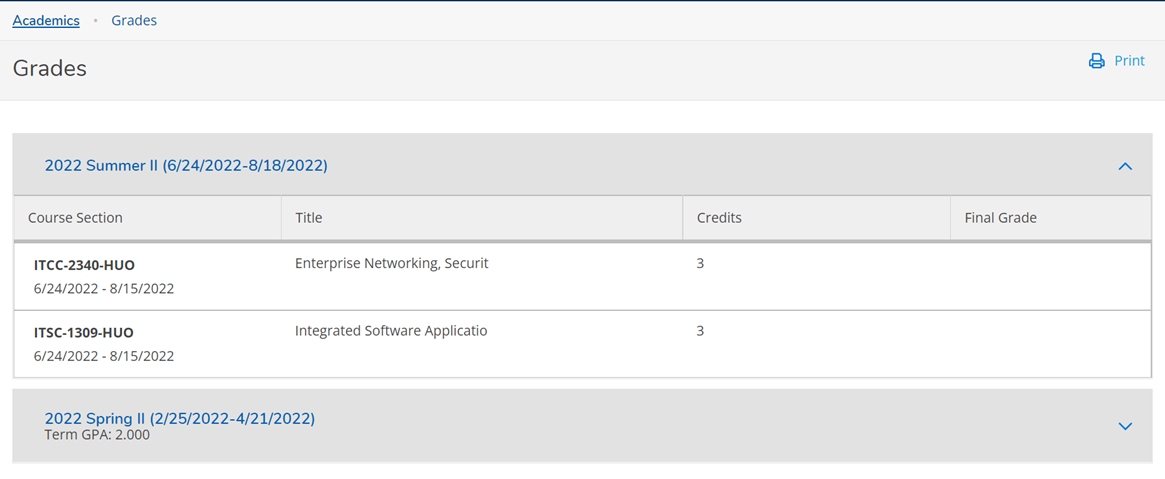 you can view your courses for the term, credits, and final grades.